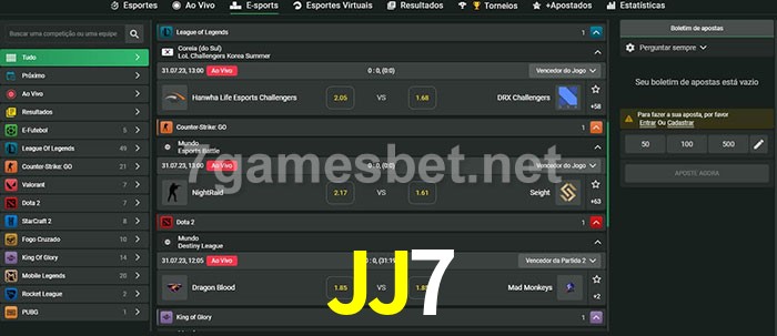 O JJ7 oferece uma grande seleção de opções de apostas em e-sports com probabilidades competitivas